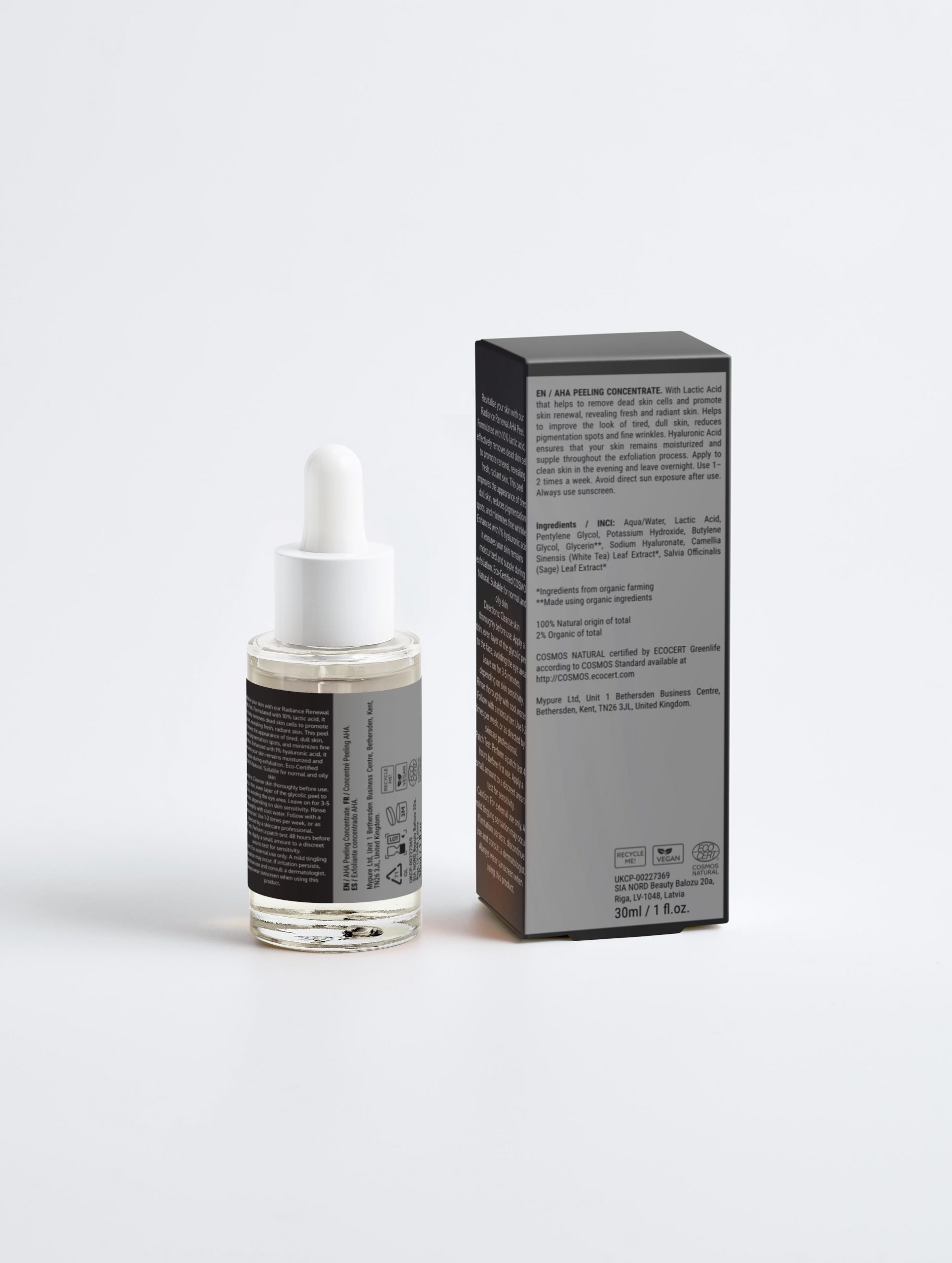 Revitalize your skin with our Radiance Renewal AHA Peel. Formulated with 10% lactic acid, it effectively removes dead skin cells to promote renewal, revealing fresh, radiant skin. This peel improves the appearance of tired, dull skin, reduces pigmentation spots, and minimizes fine wrinkles. Enhanced with 1% hyaluronic acid, it ensures your skin remains moisturized and supple during exfoliation. Eco-Certified COSMOS Natural. Suitable for normal and oily skin